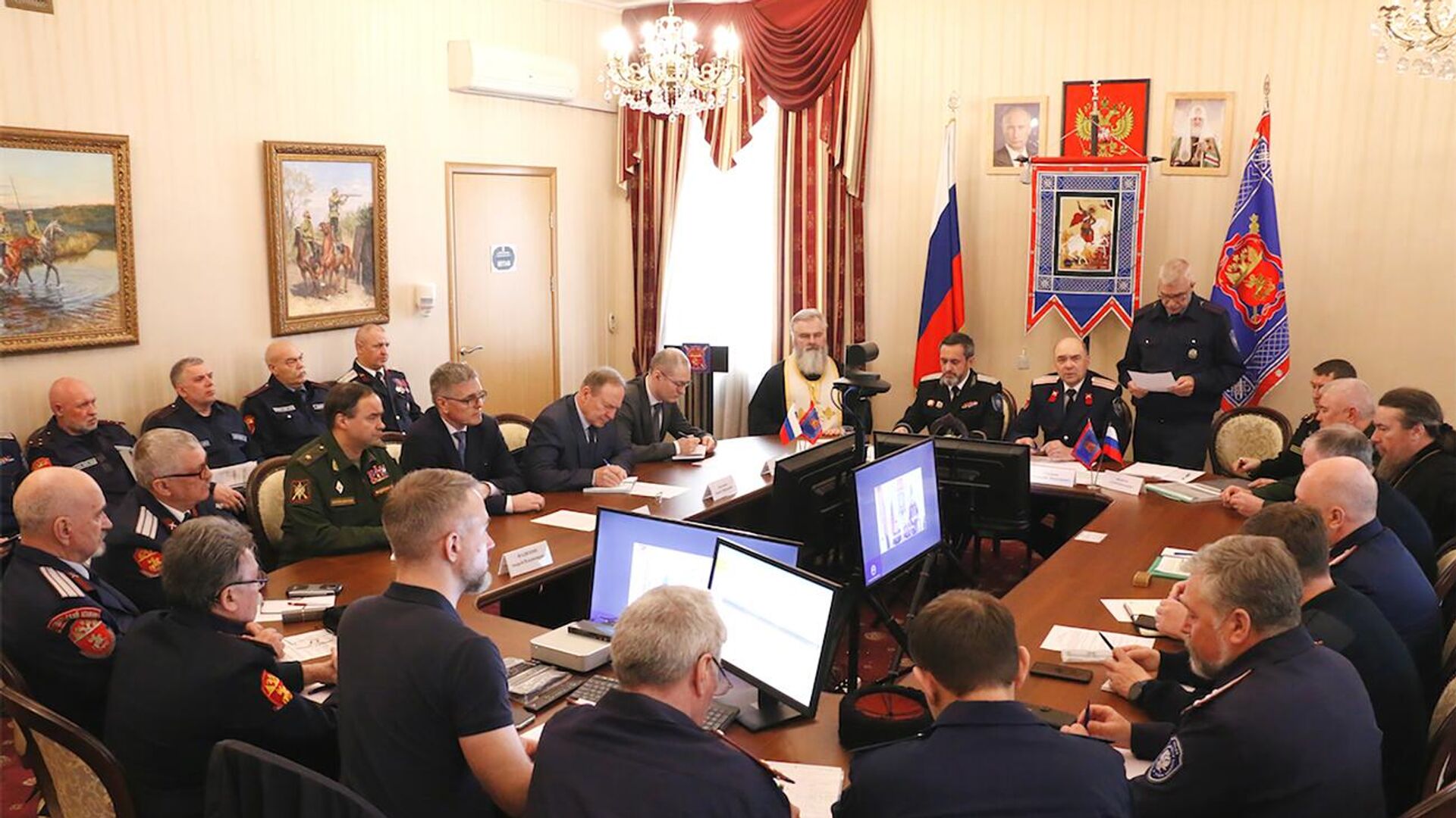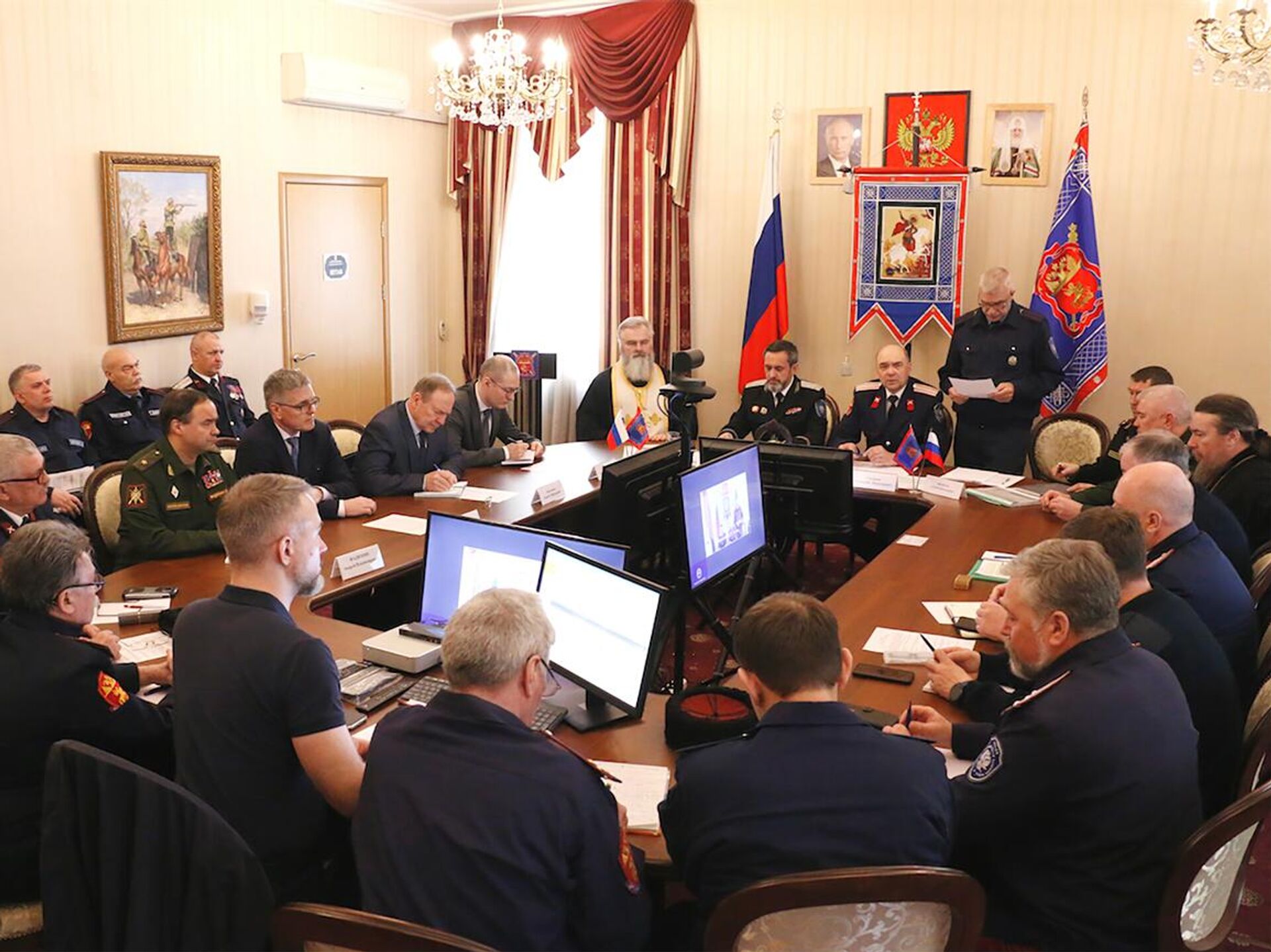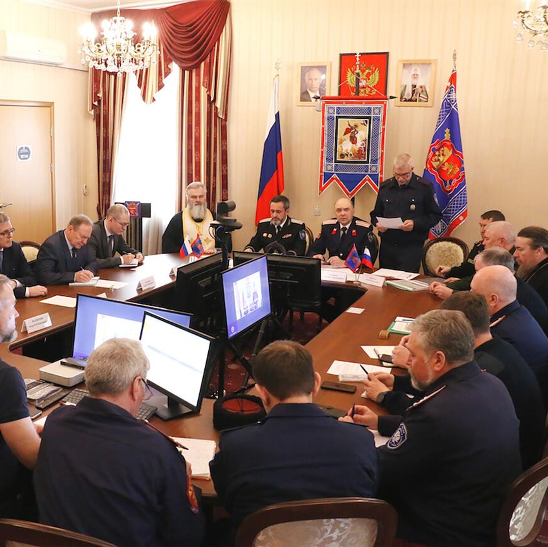 Также в заседании совета атаманов участвовали ответственный секретарь Совета при Президенте РФ по делам казачества, заместитель начальника Управления Президента РФ по вопросам государственной службы, кадров и противодействия коррупции Алексей Кириченко, заместитель полпреда Президента РФ в Центральном федеральном округе Сергей Нештенко, заместитель атамана ВсКО по организации и развитию казачьих обществ Андрей Фадюхин, войсковой священник иерей Марк Кравченко, представители Главного организационно-мобилизационного управления Генерального штаба ВС РФ и правление войска.